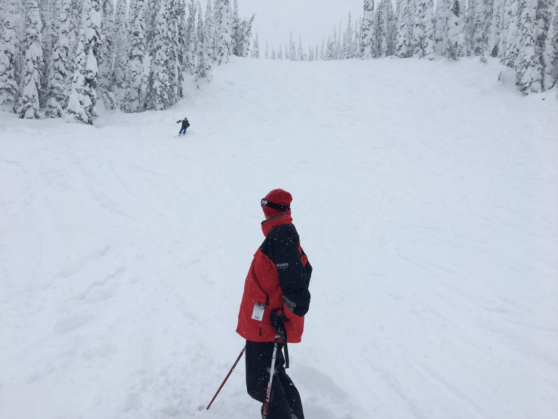 I ended up sideslipping about half of the descent and then I got onto the top of a particularly proud mogul and I recalled this tip from Eric Wagnon: When your skis are going across the crest of the bump’s backside, the tips and tails are off the snow for a moment, so it’s an ideal place to use as a “pivot point” for changing direction. I spun my skis around and started to make legitimate ski turns in that mogul field. Once that first turn is made in good form then the rest just flow! Yes my turns flowed down the hill!