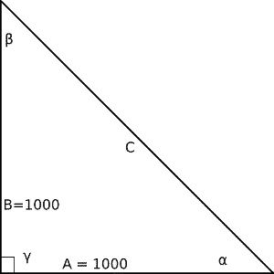 Another common term used to describe the slope of a snowboard run is in terms of percent grade. The percent grade of a slope is defined as: 100 x (the change in vertical elevation divided by the change in horizontal distance). So, in the above diagram we drop 1000 units of vertical in 1000 units of horizontal = 100*(1000/1000) which makes for 100% grade. No, a grade of 100% is not straight down.